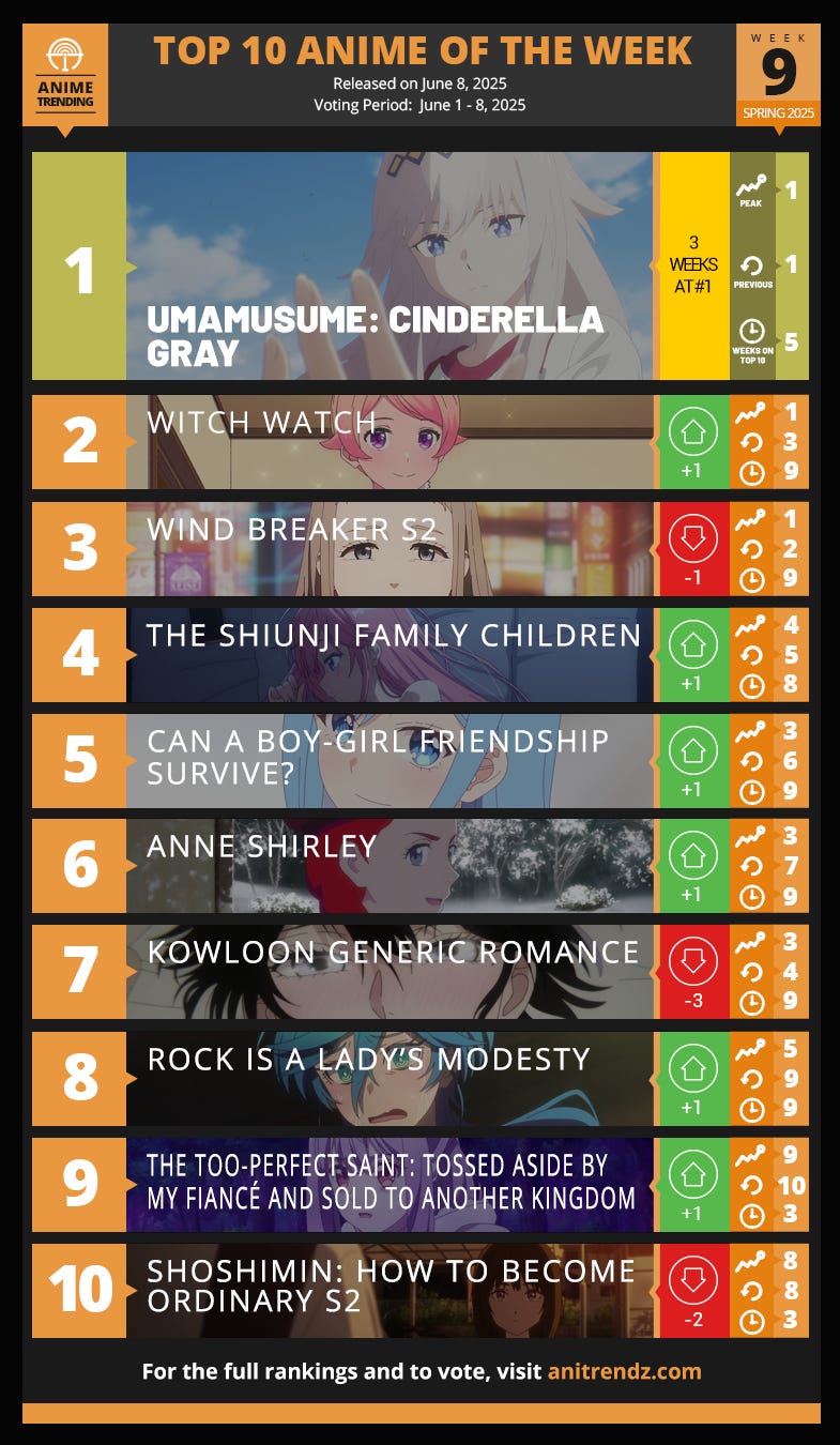 Umamusume: Cinderella Gray holds a three-week streak at first place for Week 9. WITCH WATCH climbs past WIND BREAKER into second, but will Umamusume continue its streak, or will WITCH WATCH make it back up to the top?