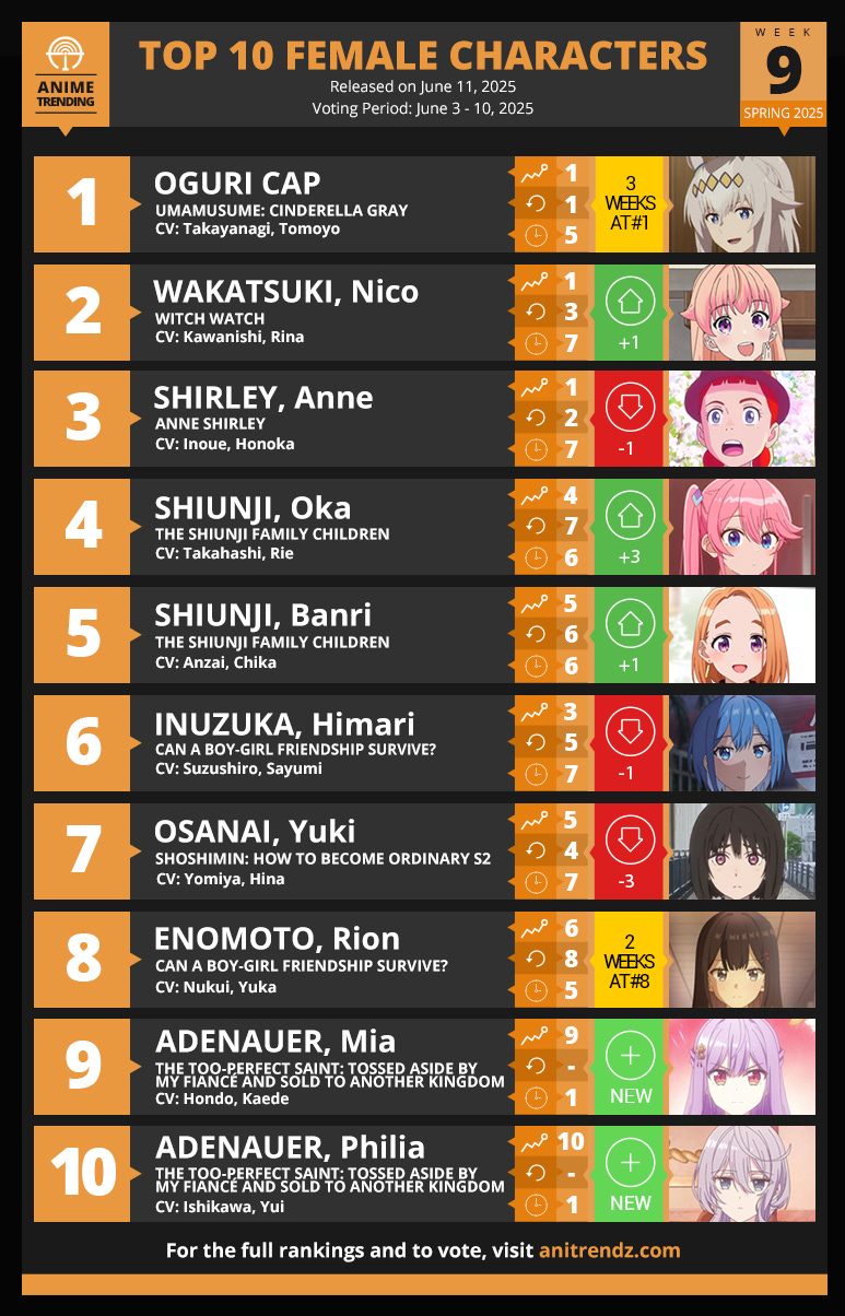 Oguri Cap remains at the top of the Female Characters Chart alongside Umamusume’s streak. Two new females join this week from The Too-Perfect Saint: Tossed Aside by My Fiancé and Sold to Another Kingdom—sisters Mia and Philia Adenauer.