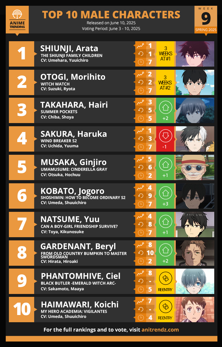 Arata and Morihito hold the top two spots on the Male Characters Chart, while Ciel (Black Butler) and Koizumi (My Hero Academia: Vigilantes) re-enter the top ten. Except for Haruka, all other males steadily climb the chart.